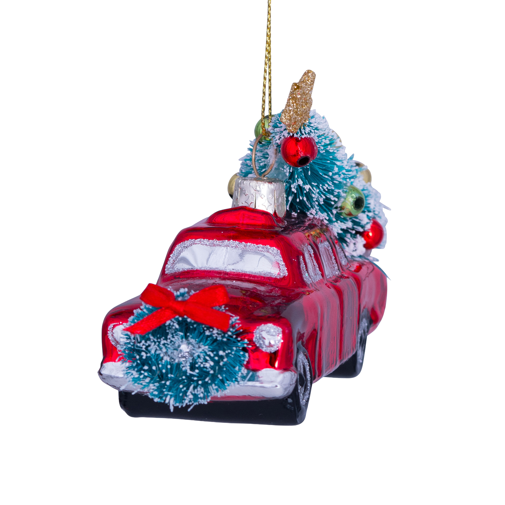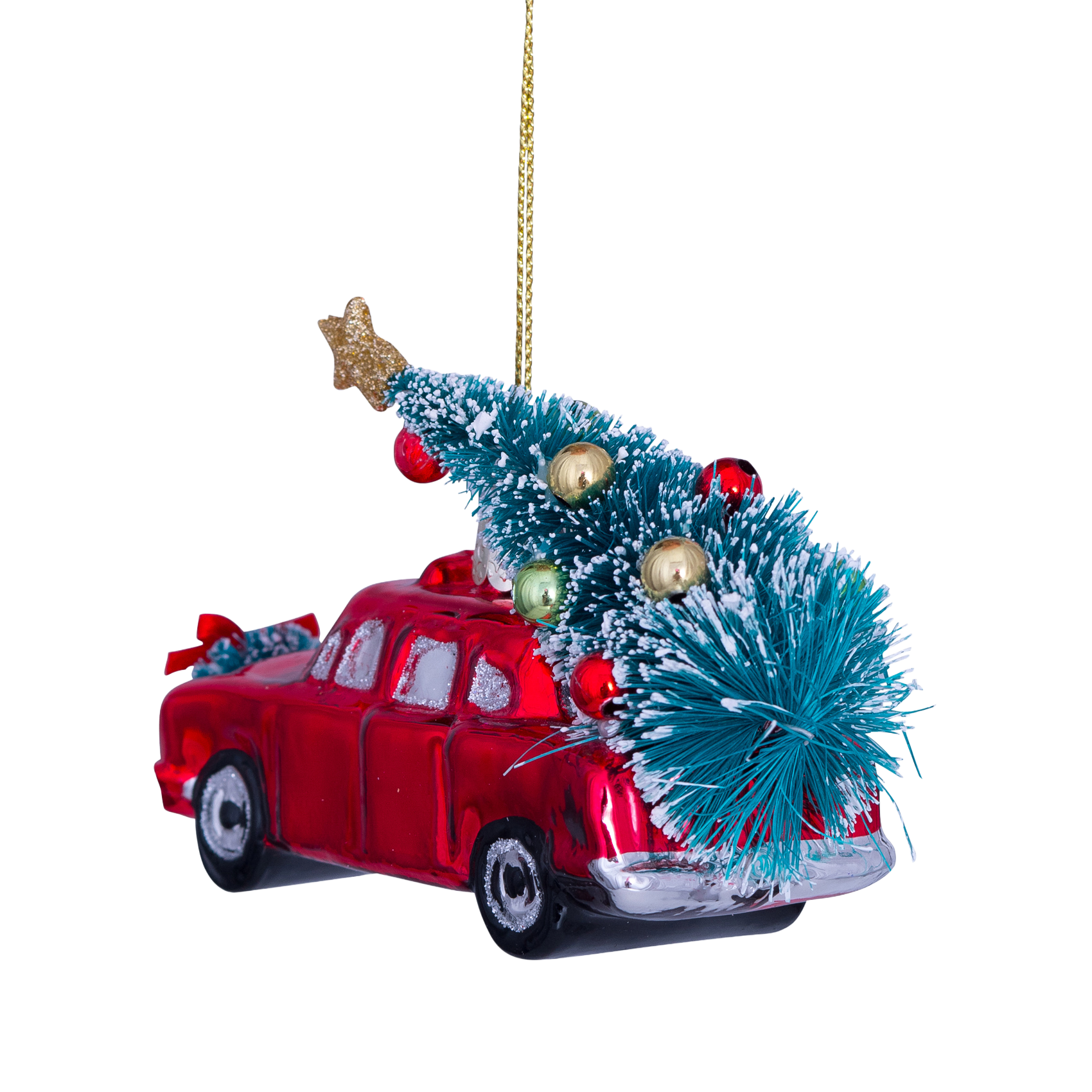 Ornament aus Glas, rotes Auto mit Weihnachtsbaum, Höhe 7,5 cm